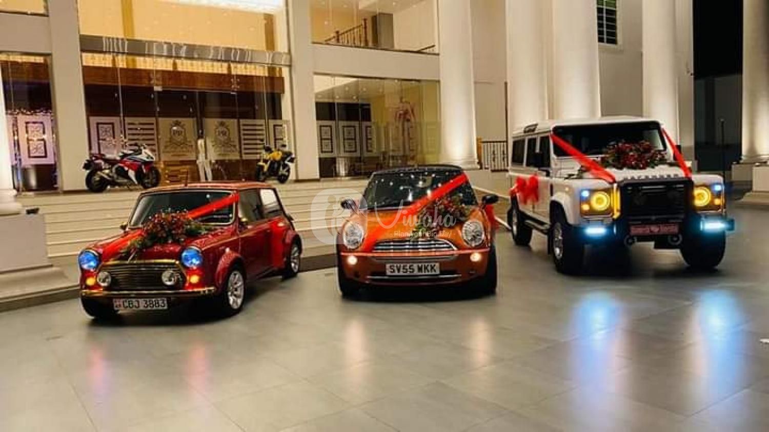 ඔබේ අතේ ඇති මුදලට ඔබට අවශ්ය ලෙස මංගල රථයක් ඔබ කැමති ලෙස මල් සැකසුම් සමග ලබා ගත හැකි අතර මංගල රථ රාශියක් අප සතුව ඇත. වගකීමක් සහිතව සාධාරණ මිළ ගනන් යටතේ ඔබගේ මංගල දිනය හැඩකර ගැනීමට, ඕනෑම මාදිලියක කාර් හෝ ජීප් රථ වෙන්කරවා ගැනීමට අමතන්න